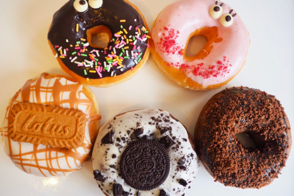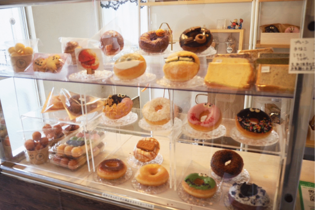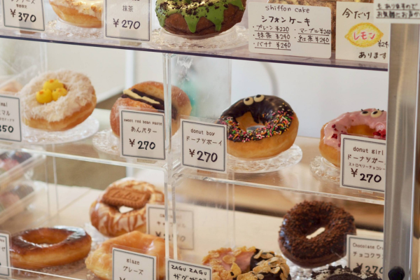 思わず写真を撮りたくなる、目がついた「ドーナツボーイ」と「ドーナツガール」。季節限定の華やかなドーナツや、ふわふわのシフォンケーキも、見た目の楽しさとおいしさを両立しています。
